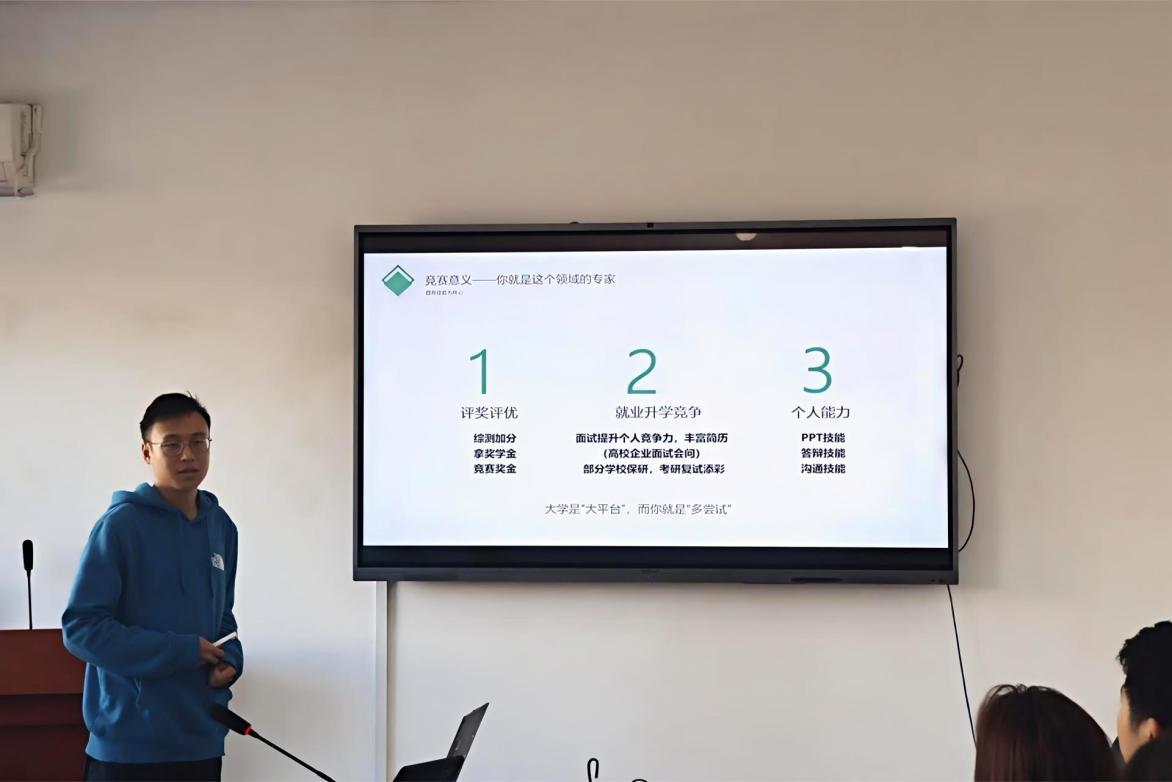 本次分享会特别邀请到2025“挑战杯”国赛主体赛二等奖“绝境逢生”团队负责人王景炫同学,作为深耕科创实践,具有丰富理论素养与实战经验的优秀学子,他以亲身经历,对参赛的意义、成长的历程及在赛事团队组建、选题研究、分工协作及现场答辩环节进行了详细讲解,为有意向参与学科竞赛的同学们提供了精准的实践指导。
